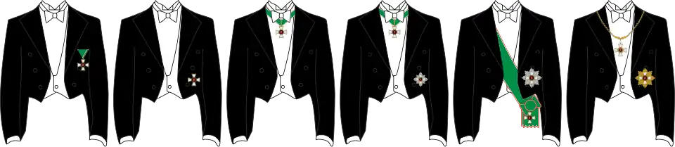 Das Großkreuz mit oder ohne Krone wird als Schulterband getragen. Zu beiden Klassen gehört ein Bruststern, der beim Großkreuz mit der Krone einen Durchmesser von 93 Millimeter (wobei aus den Winkeln des aufgelegten Verdienstkreuzes goldene Strahlen hervorkommen) und ohne Krone 89 Millimeter aufweist. Das Band des Großkreuzes ist dunkelgrün und rot-weiß gerändert und wird von der rechten Schulter zur linken Hüfte hin getragen. Das Kommandeurskreuz wird als Halsbandorden, das Offizierskreuz als Steckkreuz auf der linken Brusttasche des Beliehenen dekoriert. Der Stern des Kommandeur weist nur 79 Millimeter auf. Das Ritterkreuz sowie die Verdienstkreuze werden an einem Dreiecksband an der linken oberen Brustseite getragen. Das Band der übrigen Klassen ist einfarbig grün.