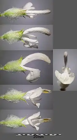 Die zwittrigen[2][4] Blüten sind bei einer Länge von 1,4 bis 2 Zentimetern[2] zygomorph und fünfzählig mit doppelter Blütenhülle. Die fünf lederigen, grün-weißlichen, manchmal rot-purpurfarbenen überlaufenen Kelchblätter sind röhrig-glockig verwachsen.[3] Der sehr dicht weiß wollig und drüsig behaarte Kelch ist 13-nervig und während der Anthese 10 bis 12 Millimeter lang und zweilippig,[3] wobei die Oberlippe länger ist als die Unterlippe.[5] Die Kelchröhre ist 13 bis 15 Millimeter lang.[5] Die Kelchoberlippe ist etwas aufwärts gebogen und endet in zwei bei einer Länge von 2 bis 5 Millimetern längeren Seitenkelchzähnen und einen etwas kürzeren[5] bis sehr kurzen[7] mittleren Kelchzahn.[3] Die Kelchunterlippe ist tief in zwei Kelchzähne geteilt,[5] die bei einer Länge von 5 bis 8 Millimetern lanzettlich mit stachelpitzigem oberen Ende sind.[3] Die fünf ungleichen, mehr oder weniger spreizenden Kelchzähne sind lanzettlich, oft violett, stechend begrannt.[3][7][6] Die fünf 10 bis 15 Millimeter langen Kronblätter sind verwachsen. Die Krone ist weißlich[2] oder weißlich-rosafarben[3] und nur auf dem Rücken kurz behaart. Die 10 bis 20 Millimeter lange, gerade[3][6] Kronröhre überragt den Blütenkelch. Sie hat innen ein Haarbüschel.[7] Die Kron-Oberlippe ist schwach gekrümmt[3] und kurz zweilappig. Die Kronunterlippe ist dreilappig mit einem breiten, tief ausgerandeten und herabgeschlagenen Mittellappen.[7] Es sind nur zwei freie, fertile Staubblätter vorhanden; sie sind am Kronschlund inseriert.[5] Um die kahlen Staubfäden herum sind Trichome vorhanden. Der Diskus ist relativ dick.[5] Der Fruchtknoten ist tief zweilappig.[5] Der nahe der Basis des Fruchtknotens inserierte, dünne Griffel ist gebogen und endet in einer meist ungleich zweigabeligen Narbe.[5] Staubblätter und Griffel überragen die Blütenkrone.[6]