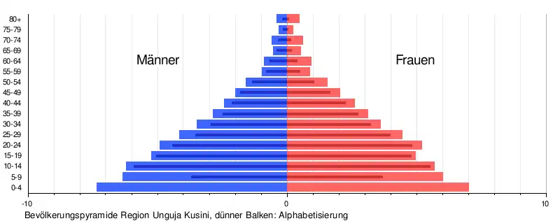 • Bildung: 23 Prozent der über Fünfjährigen sprachen Swahili, 62 Prozent Englisch und Swahili. Der Anteil der Analphabeten lag bei 15 Prozent (Stand 2012).[12]