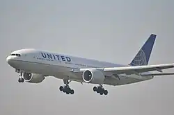 Im Jahr 1995 stellte United Airlines die damals neue Boeing 777-200 in Dienst, an deren Entwicklung die Gesellschaft maßgeblich beteiligt war. Ab Ende 1995 bot United nach dreijährigem Widerstand durch die eigenen Piloten als damals einzige Fluggesellschaft der Welt durch die Aufnahme von Neu-Delhi als Zielort planmäßigen Rund-um-die-Welt-Flugverkehr (around-the-world-service) von Los Angeles über Newark, London, New Delhi und Hong Kong zurück nach Los Angeles (jeweils in westlicher und östlicher Flugrichtung mit der durchgehenden Flugnummer „1“ beziehungsweise „2“) auf United-Maschinen an.[30] Zuvor hatte nur Pan Am von 1947 bis 1982 Flüge rund um die Welt mit eigenen Linienflügen angeboten.[31][32] 1999 wurde der Flugdienst nach Neu-Delhi, und damit der Rund-um-die-Welt-Flugverkehr, aufgrund der Asienkrise vorübergehend eingestellt, 2001 wieder aufgenommen und wenige Jahre später endgültig beendet.[33] Im Mai 1997 gründete United Airlines zusammen mit Lufthansa, Air Canada, SAS und Thai Airways die Star Alliance, wobei United Ende der 1990er Jahre als größte Fluggesellschaft der Welt galt, bis sie im Januar 2001 von American Airlines durch deren Fusion mit Trans World Airlines (TWA) überholt wurde. Die Zeit zwischen 1995 und dem Ende der 1990er Jahre war, auch aufgrund der New Economy, wirtschaftlich erfolgreich für United Airlines. 1997 erreichte der Aktienkurs von United knapp die 100 Dollar-Marke und das Unternehmen beschäftigte in diesen Jahren knapp 100.000 Mitarbeiter.