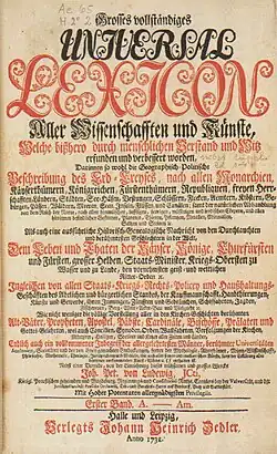- Grosses vollständiges Universal-Lexicon Aller Wissenschafften und Künste. 1731–1754 (auch „Zedlersches Lexikon“ und „Lexicon Universale Zedlerianum“ genannt)