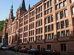 Der Bau ist vom Stilpluralismus des Späthistorismus geprägt. Elemente der deutschen und französischen Renaissance sind mit der Formensprache des Jugendstils verbunden. Dazu gehören eine Darstellung von Prometheus mit dem Adler links des Haupteingangs und eine verschleierte Jungfrau rechts davon. Über der schmiedeeisernen Tür prangt der pfälzische Löwe mit der Aufschrift Universitätsbibliothek.[2] Den zentralen Giebel der Hauptfassade schmückt eine Kopfskulptur von Pallas Athene, am Giebel der Westfassade findet sich eine Darstellung des Weltgeistes, über dessen Haupt Blattwerk, eine Weltkugel und neun Sternen angeordnet sind.[3]