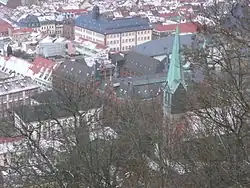 Die Universitätsbibliothek Heidelberg aus der Vogelperspektive, gewährt auch einen Blick auf die Alte Universität und auf die Peterskirche