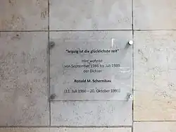 „"leipzig ist die glücklichste zeit" / Hier wohnte / von September 1986 bis Juli 1989 / der Dichter / Ronald M. Schernikau (11. Juli 1960 – 20. Oktober 1991)“[18]
