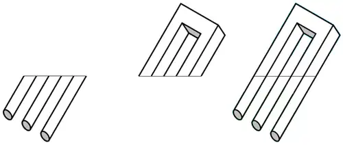 Verschiebt man die linke Teilfigur parallel so weit nach rechts, bis deren obere waagerechte Begrenzung mit der unteren waagerechten Begrenzung der mittleren Teilfigur zur Deckung kommt, so entsteht der rechts abgebildete unmögliche Dreizack.
