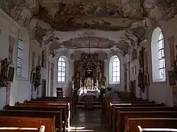 Die Kirche besteht aus einem langen Raum zu vier Achsen mit einem dreiseitigen Schluss. Sie ist flach gedeckt und besitzt eine Hohlkehle mit abgemuldeter Decke. Die Wandgliederung wird durch Paare von rötlich marmorierten korinthischen Pilastern erreicht. Die Paare stehen ziemlich weit auseinander und sind in der Voute durch in Stuckprofilen angedeutete flache Schildbogen über den eingezogenen rundbogigen Fenstern verbunden. An den Seiten der Chorscheitelachse ist nur je ein Pilaster-Oberteil angebracht. In der östlichen Achse befinden sich beiderseits marmorierte Rechtecktüren, wovon die nördliche zum Turm, die südliche zur Sakristei mit dem darüber liegenden Oratorium führt. Über der Sakristeitüre befindet sich eine rundbogige Oratoriumsöffnung. Der Scheitel des Chores besitzt kein Fenster. Im Westen des Langhauses befindet sich eine Empore und eine ins Vorzeichen führende Stichbogentür.