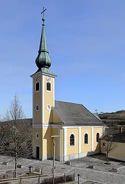 • Die Pfarrkirche hl. Johannes Nepomuk ist eine schlichte josephinische Saalkirche in der Ortsmitte, die 1766 als Kapelle errichtet und nach der Pfarrerhebung von 1784 bis 1785 von Johann Schwerdtfeger vergrößert wurde. 1868 wurde der Turm um ein Schallgeschoß erhöht und erhielt einen neuen Turmhelm.[4]