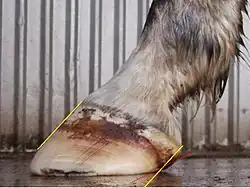 Dieses Phänomen lässt sich fast als Zivilisationskrankheit der Pferde bezeichnen. Es zeigt sich bei fast allen dauerhaft beschlagenen Pferden und bei vielen unbeschlagenen. Betrachtet man einen Huf exakt von der Seite, so verlaufen die Hornröhrchen der Hufwand von der Zehe bis zur Trachtenkante parallel, eher noch an den Trachtenkanten etwas steiler als an der Zehe. Eine Hornkapsel ist geometrisch betrachtet ein Ausschnitt eines schiefen Kegelstumpfes. Bei Untergeschobenen Trachten geht diese Lage der Hornröhrchen im Trachtenbereich verloren. An den Trachten liegen die Hornröhrchen flacher als an der Zehe, nicht immer so extrem wie auf dem Foto hier, aber wenn mit bloßem Auge sichtbar die Trachten flacher stehen als die Zehe hat das Pferd untergeschobene Trachten.