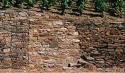 Ab dem 9. Jahrhundert gibt es eine reiche Urkundenlage des Weinbaus für fast alle Orte der Untermosel.[10] (z. B. Ediger im Jahre 766, Kobern 817, Bruttig 898). Viele Weinbergsflächen waren wahrscheinlich noch Flach- oder untere Hanglagen. Das Hochmittelalter gilt bisher als die Epoche, in der Bauhandwerker begannen, in Steilhängen der Mosel hohe, standfeste Terrassenmauern zu errichten – abgeleitet von der Fertigkeit, auf ragenden Felsrücken und über steilen Abgründen bautechnisch anspruchsvolle Burganlagen zu erbauen. Die Terrassenmauern wurden wohl überwiegend trocken gesetzt: Der viele Mörtel, der für das unregelmäßige Bruchsteingewerk benötigt wurde, wäre schlichtweg zu teuer gewesen. Rund 30 Prozent der Baukosten kosteten Erzbischof Balduin[11] das Brennen und der Transport des erforderlichen Kalks für Mörtel und Putz seines Burgenbaus im Raum Mittelrhein-Untermosel. (Abb. 16 u. 17).