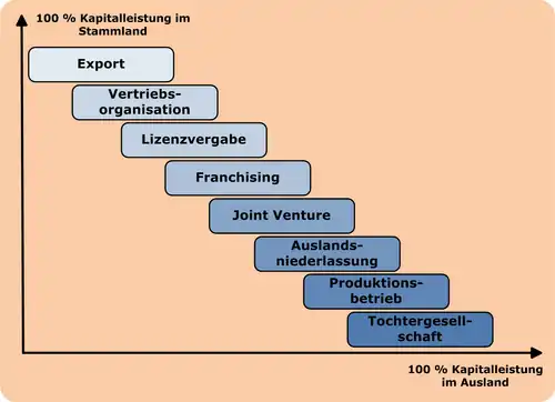 Internationalisierung heißt die geografische Dezentralisierung der Unternehmenstätigkeit auf internationalen Märkten. Sie gewinnt durch eine zunehmende Globalisierung der gesamten Unternehmenstätigkeit immer mehr an Bedeutung. Beweggründe für Internationalisierung sind die Sicherung des Absatzes durch größere Marktnähe, die Senkung der Lohn- und Lohnnebenkosten, Risikostreuung, Umgehen von Importrestriktionen, Realisierung von Transportkostenvorteilen, Beschaffungsvorteile im Ausland, Investitionsfördermaßnahmen durch die ausländischen Staaten sowie Unabhängigkeit von der Entwicklung der Devisenkurse.[32] In welcher konkreten Form Internationalisierung erfolgt, ist abhängig von der Situation des jeweiligen Unternehmens und seiner Strategie. Die Stufen der Internationalisierung in Abhängigkeit von Kapital- und Managementleistungen sind Export, Lizenzvergabe, Franchising, Joint Venture, Auslandsniederlassung und Tochterunternehmen.[34]