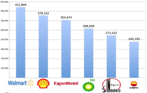 Nach Umsatz war im Geschäftsjahr 2011 der Ölkonzern Royal Dutch Shell das weltweit größte Unternehmen,[28] nach Marktkapitalisierung am 30. Juni 2012 der Hardware- und Softwarehersteller Apple.[29]