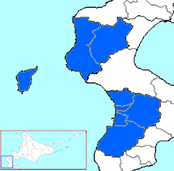 Die Unterpräfektur Hiyama erstreckt sich über den westlichen Teil der Oshima-Halbinsel – der östliche Teil gehört zur Unterpräfektur Oshima – und die Insel Okushiri.