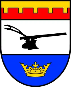 Blasonierung: „Unter gold über rot durch Zinnenschnitt geteiltem Schildhaupt, von silber über blau geteilt, oben ein linksgewendeter schwarzer Wendepflug, unten eine dreizackige goldene Krone.“[10] |