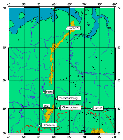 | Südlicher Ural | Juschny Ural | 52°… 55°40' N | 57°… 60° O | südlich des Oberlaufs der Ufa bis auf Höhe der Stadt Orsk | 1640 m, Jamantau |