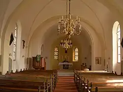 Über dem Altar hängt ein wahrscheinlich 800 Jahre altes Triumphkreuz, das 1970 stark beschädigt unter Geröll auf dem Kirchboden gefunden wurde. Es hing im ersten Kirchenschiff, das 1770 ersetzt wurde. Man restaurierte es und verband es mit dem vorher in der Kirche freischwebenden Christuskorpus.