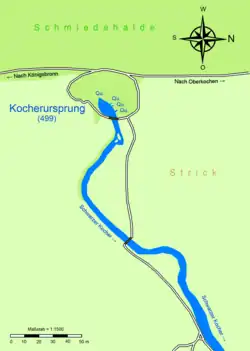 Die Karstquelle liegt südlich der Stadt Oberkochen auf 499,2 m ü. NHN an den westlichen Talhängen. Der dort entspringende Kocherquellfluss fließt durch das Urbrenztal in Richtung Nordosten nach Unterkochen, wo er sich mit dem Weißen Kocher vereinigt.