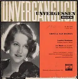4. a b Karl-Josef Kutsch/Leo Riemens/Hansjörg Rust: Großes Sängerlexikon. 4. Auflage. Band 4. De Gruyter, Berlin 2003, ISBN 978-3-598-44088-5, S. 1165. Die Angaben zu van Diemens Biografie in dieser Quelle sind fehlerhaft nicht allein, was die Herkunft der Eltern angeht. Auch wird behauptet, sie habe „später einen Amerikaner geheiratet“. Tatsächlich blieb Ursula van Diemen nach ihrer ersten Ehe unverheiratet.
