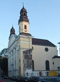 Während des Zweiten Weltkrieges wurden sowohl die Kirche als auch die anderen zum Orden gehörenden Gebäude unter anderem durch Bombentreffer stark beschädigt. Das Dach und das Gewölbe sowie die Innenausstattung der Kirche wurden völlig zerstört. Von der einst reichen barocken und historischen Ausstattung blieb nur das Stuckrelief am Triumphbogen weitgehend unbeschadet erhalten. Damit die Kirche schnellstmöglich wiedereingedeckt und die Schäden im Inneren behoben werden konnten, organisierten die Schülerinnen und die Ordensschwestern mehrere Basare.[3] Der Wiederaufbau dauerte bis 1963.