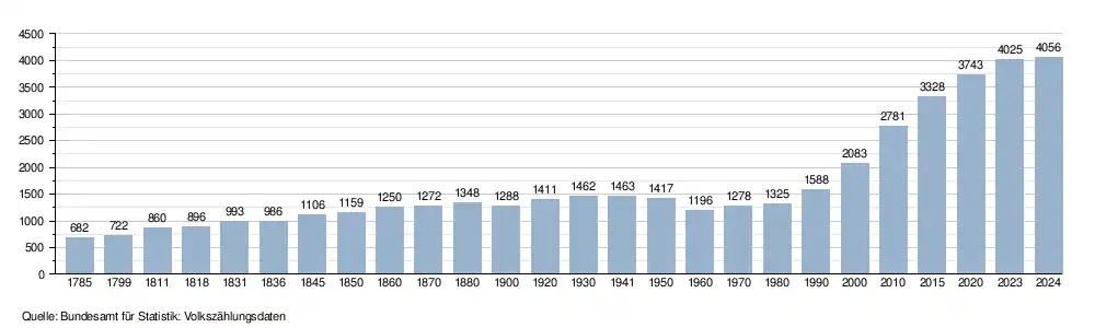 - ↑ a b Daten der Eidgenössischen Volkszählungen ab 1850 nach Gemeinden. (XLSX; 10 MB) Bundesamt für Statistik, Neuchâtel, 12. Juli 2024, abgerufen am 18. September 2025 (Öffnung in Excel nur über "Anhang/Excel-Datensatz" möglich).