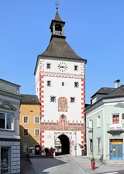 Unterer Stadtturm in Vöcklabruck; von der Vorstadt aus gesehen | ||