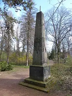 Das sechs Meter hohe Denkmal besteht aus einem Stufenpodest, einem Sockelstein und dem eigentlichen Obelisken.[4] Die Inschriften am Sockelstein berichten vom Grund der Errichtung sowie von der Restaurierung, beziehen sich aber auf den vorherigen Standort: