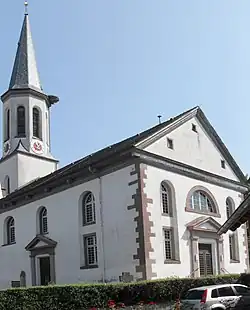 - Auch die Evangelische Kirche, die 1803 nach Plänen von Friedrich Weinbrenner erweitert wurde, steht mitten im Dorf. Sie enthält eine historische Orgel von Mathias Martin.
