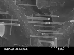 Der VLS-Mechanismus wurde 1964 als eine Erklärung für das Silicium-Nanodrahtwachstum aus der Gasphase in Gegenwart eines flüssigen Gold-Tröpfchen auf einem Silicium-Substrat vorgeschlagen.[1] Angeregt wurde die Erklärung durch das Fehlen von axialen Schraubenversetzungen, die für sich ein Wachstumsmechanismus darstellen, in den Nanodrähten, durch die Notwendigkeit eines Goldtröpfchens für das Wachstum, und die Anwesenheit des Tropfens an der Spitze der Nanodrähte während des gesamten Wachstumsprozesses.