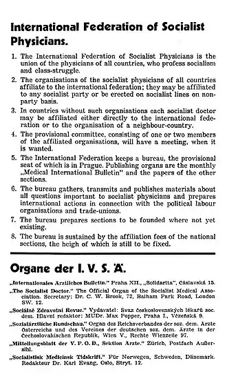 - ↑ Die sozialistische Ärzte-Internationale. In: Der sozialistische Arzt, 6. Jg. (1930), Heft 1 (Februar), S. 27–30 ; Textarchiv – Internet Archive