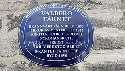 „STADTGESCHICHTLICHE VEREINIGUNG STAVANGER · VALBERGTÅRNET · FEUERWACHTURM ERRICHTET 1853 · IM GEBRAUCH DER STADTWACHE BIS 1922 · ARCHITEKT CHR. H. GROSCH · NEUROMANISCHER STIL · GESCHÜTZT · VORHER STAND HIER EIN · ACHTKANTIGER TURM AUS HOLZ · GEBAUT 1658“