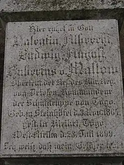 Stattdessen wurde er als Oberleutnant mit Beförderung zum 15. Februar 1896 im Kürassier-Regiment „von Driesen“ à la suite gestellt und nach seiner Ankunft am 4. Mai 1896 zum Kommandeur der Polizeitruppe in Togo ernannt. Später diente er als Stationschef in Bassari. In den Jahren 1896 und 1897 unternahm er mehrere Expeditionen in das Hinterland von Togo, darunter eine gegen die Dagomba (1896) und zwei Feldzüge gegen die Konkomba (1897–1898).[3] Nachdem er die Führung der deutschen Kommission der französisch-deutschen Grenzabsteckungsarbeiten zu Französisch-Westafrika übernommen hatte, starb er am 23. Juli 1899 an Malaria in Kirikiri (heute Adjéidè) im Norden der Kolonie. Seine Leiche wurde auf Wunsch der Familie 1900 nach Deutschland überführt und in Steinhöfel begraben.