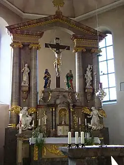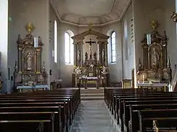 Der 1810 angefertigte Hauptaltar im Chor zeigt als zentrales Motiv eine Kreuzigungsgruppe, die von weiteren Figuren umgeben ist. Der links des Chors aufgestellte Marienaltar und der rechts des Chors aufgestellte Valentinsaltar tragen jeweils Figuren der Heiligen. In einer Nische in der Nordwand ist außerdem eine Pietà aufgestellt. Seitlich des Chors an der Nordwand befindet sich eine barocke Kanzel mit schmuckvollem, puttenbekröntem Schalldeckel.