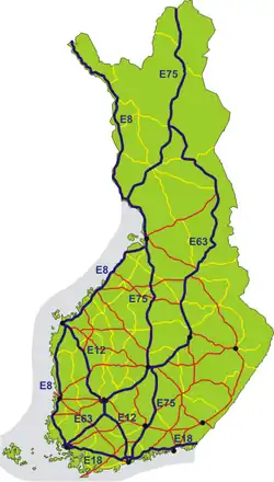 Im finnischen Straßennummerierungssystem sind die Nummern 1–39 für die Staatsstraßen vorgesehen, genutzt werden derzeit 1–16 und 18–29. Auf Straßenschildern sind die Hauptstraßen mit einer weißen Nummer auf rotem Grund gekennzeichnet. Insgesamt 700 km der Staatsstraßenstrecken sind autobahnartig ausgebaut, die Autobahnen stellen aber keine separate Straßenkategorie dar. Teilweise folgen Europastraßen dem Verlauf der finnischen Staatsstraßen.