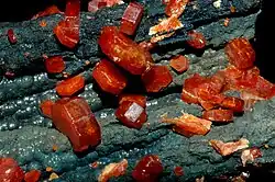 Zu den wichtigsten Vanadiummineralen zählen vor allem Vanadate wie Vanadinit [Pb5(VO4)3Cl], Descloizit Pb(Zn,Cu) [OH|VO4] und Carnotit [K2(UO2)2(VO4)2·3H2O], sowie das Vanadiumsulfid Patrónit VS4. Der größte Teil des Vanadiums findet sich in Spuren in anderen Mineralen, vor allem Eisenerzen wie Magnetit. Der Vanadiumgehalt von Titan-Magnetit-Erzen beträgt meist zwischen 0,3 und 0,8 %,[18] kann aber in manchen südafrikanischen Erzen bis zu 1,7 %[16] erreichen.