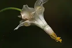 Die zwittrigen Blüten sind bei einem Durchmesser von 6 bis 14 Millimetern radiärsymmetrisch und dreizählig.[1][3] Es sind zwei Kreise mit je drei Kelchblättern vorhanden.[1] Die sechs weißen bis gelben[1] Kelchblätter sind 8 bis 9 Millimeter lang[2]. Es sind zwei Kreise mit je drei Kronblättern vorhanden. Die sechs weißen bis gelben Kronblätter sind kapuzenartig mit einem zurückgekrümmten oder flachen oberen Ende, das Nektar enthält.[1] Es sind zwei Kreise mit je drei Staubblättern vorhanden;[1] sie befinden sich eng am Fruchtblatt[2]. Die Staubbeutel öffnen sich oft mit zwei schwenkbaren Klappen.[1] Die Exine des Pollens ist gestreift.[1] Die zwei bis zehn[2] anatropen, bitegmischen[4] Samenanlagen sind ellipsoid und die Plazentation marginal.[1] In jeder Blüte gibt es nur ein oberständiges Fruchtblatt. Der einfache Griffel befindet sich seitlich am Fruchtblatt.[1] Die Narbe ist becherförmig.[2]
