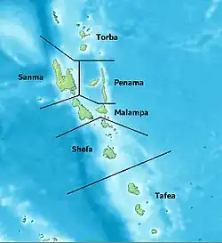 Vanuatu besteht aus den sechs Provinzen Malampa, Penama, Sanma, Shefa, Tafea und Torba, deren Namen sich aus den Namen der Einzelinseln zusammensetzen.