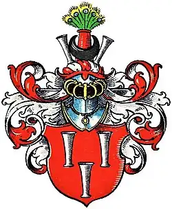 Blasonierung: In Rot drei (2:1) hohe silberne Trinkgefäße. Auf dem rot-silbern bewulsteten Helm ein liegender schwarzer Halbmond (Spitzen nach oben), begleitet von zwei hohen silbernen Bechern. Hinter dem Halbmond ein grüner Pfauenwedel mit rotem Griff. Die Helmdecken sind rot-silbern.[1]