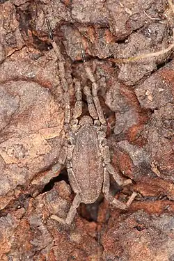 Der flache Körper ist einfarbig braun gefärbt und 6 bis 9 mm lang. Vorne auf dem schildförmigen Körper sitzen die Augen. Im Vergleich mit den meisten anderen Weberknechten sind die Beine relativ kurz. Bei Schäden an den Beinen können diese abgeworfen werden und sich regenerieren (Autotomie). Die Art tarnt sich häufig dadurch, dass sie Erdklümpchen an ihren Körper anheftet.