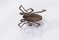 Blick auf die Unterseite. Erkennbar sind in dieser Lage die Chelizeren in der von zwei Chitinbögen gebildeten Chelizerenkappe.