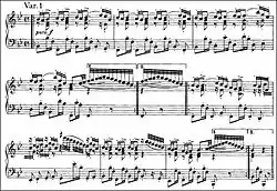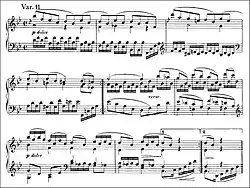 Variation I Die erste Variation wird durch einen Auftakt aus fünf 32tel-Noten in der seconda volta des Themenendes übergangslos mit dem Thema verbunden, an dem sie sich noch stark orientiert: in der Oberstimme am Melodiegerüst, in den Unterstimmen an den Wechselnoten b-a-b und am grundlegenden Bass. Rechte und linke Hand bilden sich komplementär ergänzende durchgehende 16tel im staccato. Betonte Akkorde auf halben Zählzeiten erzeugen synkopische Wirkungen, wodurch die 16tel-Bewegung in den Hintergrund gelangt.[17] |