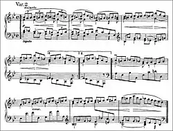 Variation II Die zweite Variation bildet zur ersten, rhythmisch akzentuierten Staccato-Variation einen starken Gegensatz: durchwegs ist legato vorgeschrieben. Durch eine animato auszuführende Überlagerung von Achteln und Achteltriolen sowie durch chromatische Wechselnoten in der vom Melodiegerüst des Themas geprägten Oberstimme und chromatische Gängen in den Unterstimmen verwischen die Konturen. Häufige crescendi und decrescendi innerhalb eines piano unterstützen das Auf und Ab dieser Variation. Übergangslos mündet die zweite Variation in die dritte. |
