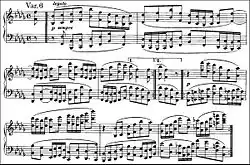Variation X Forte und energico beginnen die beiden Teile des Vordersatzes, die wie die gesamte Variation von Achtel-Triolen geprägt sind. Linke und rechte Hand setzen im Wechsel die ungefähre Grundgestalt der Themenmelodie zusammen und gelangen dabei in immer tiefere Oktavlagen. Die Dynamik nimmt ab und die beiden Teile enden jeweils pp. Gleichzeitig wird aus dem hellen B-Dur ein dunkles b-Moll. Im weitgehend forte gehaltenen Nachsatz scheint sich b-Moll nach einer Ausweichung nach Ges-Dur durchzusetzen, doch der dynamisch zurückgenommene Schluss bietet keinen vollständig abschließenden Dreiklang, sondern eine ambivalent wirkende leere Quinte. Die dadurch erzeugte Spannung löst sich erst im B-Dur der nächsten Variation. |