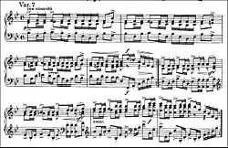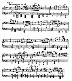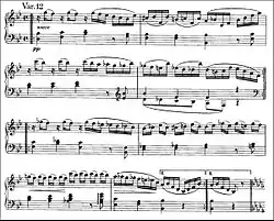 Variation XIII Largamente, ma no piú ist die dreizehnte Variation überschrieben. Sie bildet den gewichtig wirkenden Mittelpunkt der Variationenreihe, ist in b-Moll und soll laut und espressivo gespielt werden. Im Vordersatz kann man in der Oberstimme die variierte Grundgestalt der Themenmelodie und in der nachschlagenden Begleitung die Wechselnoten b-a-b der Themenunterstimmen erkennen. Ausweichungen in das parallele Des-Dur verändern den Mollcharakter dieser Variation ein wenig. Die weitgehend in Sexten geführte Oberstimme weist bereits auf die Sexten-Passagen der nächsten Variation hin. |