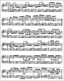 Variation VII und Variation VIII Diese beiden ineinander übergehenden, con vivacitá vorzutragenden Variationen werden von einem Rhythmus geprägt, der zwischen daktylischer und anapästischer Wirkung wechselt und im Nachsatz der Aria vorgebildet ist. Während dieser Rhythmus in der siebten Variation alle Stimmen erfasst, dient er in der achten Variationen dazu, den in der Unterstimme liegenden Orgelpunkten auf der Tonika und der Dominante einen ostinaten Rhythmus zu verleihen. Die zwei Oberstimmen der achten Variation sind im doppelten Kontrapunkt komponiert, was dazu führt, dass der Nachsatz der achten Variation auf die doppelte Länge erweitert wird. In beiden Variationen kommen Ausweichungen vor, in der siebten nach d-Moll und Es-Dur, in der achten nach b-Moll und Es-Dur. Zwar entsteht auch nach diesem Variationenpaar durch eine Fermate über dem Schlussstrich eine Zäsur, doch wird durch den unvollständigen letzten Takt auch angezeigt, dass die achte und die mit einem 16tel-Auftakt beginnende neunte Variation zusammengehören. |