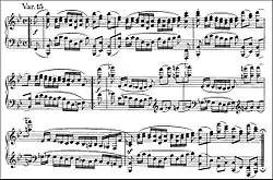 Variation XXIII und Variation XXIV Die beiden vivace zu spielenden Variationen bilden ein ineinander übergehendes Variationenpaar mit identischer Form. Sie stehen im 12⁄8-Takt und ähneln dadurch der zehnten Variation, in der die vier Dreiereinheiten eines Taktes allerdings als Triolen notiert sind. Ihre Vordersätze stehen auf einem Orgelpunkt (Variation XXXIII) beziehungsweise auf einer Bordunquinte (Variation XXIV) und pendeln zwischen dem B-Dur-Dreiklang und dem manchmal vollständigen, manchmal unvollständigen verminderten Septakkords a-c-es-ges. Die Nachsätze beginnen mit der Dominante und bringen danach den Quartsextakkord ges-c-es. Kurz darauf wird das ges zum fis enharmonisch umgedeutet, wodurch sich ein chromatisch aufwärts drängender Bass vom Fbis zum B ergibt. Beide Variationen haben nahezu denselben dynamischen Verlauf, der im Ansatz leise ist, immer wieder kurze Crescendi zum forte verlangt und insgesamt von leise nach laut führt. Im Wesentlichen ist die fünfzehnte Variation eine figurierte vierzehnte Variation. Deren aus Achtelnoten bestehende gebrochenen Akkorde werden teilweise mit 16tel-Noten aufgefüllt. Dadurch entsteht in der fünfzehnten Variation eine stringente durchlaufende 16tel-Bewegung, die ohne eigentliches Ende am Ende mit der Terz ges-b den verkürzten Sextakkord der Mollsubdominante bringt. Ihm folgt ohne Halt das klare B-Dur der letzten Variation. |