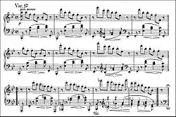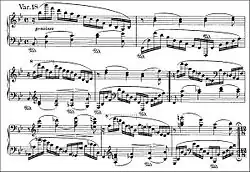 Variation XVIII Die achtzehnte Variation wird durch eine Fermate von der vorherigen abgetrennt, obwohl sich beide Variationen im Wesentlichen ähneln. Linke und rechte Hand teilen sich die auch hier zweistimmig gesetzte, aber synkopische, mit portato und legato differenziert bezeichnete, variierte Themenmelodie auf. Vom Pedal unterstützt wird sie von meist abwärts gerichteten zerlegten Akkorden umrankt. Auch die achtzehnte Variation durcheilt im Nachsatz b-Moll, Des-Dur und es-Moll/Es-Dur und endet in der Haupttonart. |