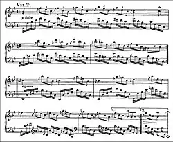 Variation XIX Die Bezeichnung dieser Variation lautete im ersten Autograph zunächst molto vivace und wurde dann in vivace e leggiero und im Druck schließlich in leggiero e vivace umgeändert.[4] Alle drei Bezeichnungen verhindern, dass sich das Metrum aus viermal drei Achteln in ein gemächliches Dreiermetrum aus je vier Dreiachteltakten auflöst. So entsteht ein heiteres Siciliano, das mit den Pralltrillern einen barockisierenden Charakter annimmt. Die Töne der Themengrundgestalt werden auf Unter- und Mittelstimmen verteilt, was durch das Hervortreten der mit Punktierungen und Prallern versehenen Stimmen verunklart wird. Der Vordersatz wird eine Oktave höher wiederholt, wobei die Punktierungen und Praller in die Oberstimme gelangen. Beim Nachsatz wird die Wiederholung wegen des unterschiedlichen Auftaktes und der auch hier bei der Wiederholung in die Oberstimme verlagerten Punktierungen und Pralltriller ausgeschrieben. Dem letzten Takt fehlt ein Achtel, das sich im Auftakt der nächsten Variation finden lässt. |