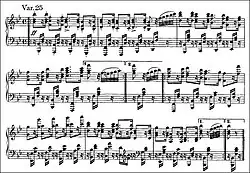 Variation XXV Fortissimo folgt die fünfunftwanzigste Variation. Die einfache Harmonik entspricht ganz der des Themas. Im Vordersatz stecken in den Akkorden der rechten Hand die Stammnoten der Themenmelodie. Rechte und linke Hand ergänzen sich akkordisch zu durchgehenden, komplementären Sechzehnteln. Nur an betonten Stellen auf der Drei der Takte werden die Akkorde als punktierte Noten ausgehalten, sonst im Staccato als Achtel mit einer Sechzehntelpause von der dazugehörigen Sechzehntelnote abgetrennt. |
