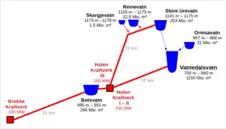 Das Netzwerk von Stauseen für die Kraftwerke Holen[5] und Brokke[7] gliedert sich in drei Teile. Das schon 1964 in Betrieb genommene Brokke Kraftverk in der Kommune Valle wird über einen 31 km langen Tunnel vom Botsvatn gespeist (Höhenlage 495–551 m) mit einer Fallhöhe von 300 m. Das Holen Kraftverk hat seinen Auslass in den Botsvatn und wird zum einen durch den Vatnedalsvatn (Höhenlage 700–840 m) und zum anderen durch den Store Urevatn (Höhenlage 1141–1175 m) und zwei kleinere an denselben Tunnel angeschlossene Seen gespeist. Auch wenn alle drei Turbinen des Kraftwerks in derselben unterirdischen Halle stehen, werden sie als getrennte Kraftwerke angesehen, mit einer Fallhöhe von etwa 250 m für die Turbinen I-II von 1981 (Vatnedalsvatn) und von 610 m für die Turbine III von 1986 (Store Urevatn). Der 13 km lange und bis zu 1,5 km breite Vatnedalsvatn hat einen Speicherraum von 1150 Mio. m³ und wird in seinem 240 km² großen Einzugsgebiet unter anderem von den höher liegenden Seen Ormsavatn und Store Urevatn gespeist. Die von Otra Kraft betriebenen Kraftwerke Brokke und Holen haben zusammen eine Installierte Leistung von 720 MW und produzieren jährlich etwa 2,4 TWh elektrische Energie, was etwa 2 % der norwegischen Jahresproduktion entspricht.[4][8]