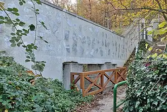 ![]() Vergitterter Durchlass für den Veitlissengraben in der Mauer des Lainzer Tiergartens | ||