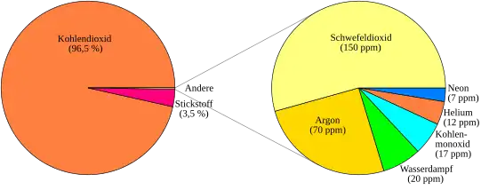 Die Atmosphäre der Venus besteht hauptsächlich aus Kohlendioxid. Stickstoff macht 3,5 % aus, Schwefeldioxid (150 ppm), Argon (70 ppm) und Wasser[11] (20 ppm) kommen in Spuren vor. Wegen der großen Gesamtmasse der Atmosphäre befindet sich in ihr etwa fünfmal so viel Stickstoff wie in der Erdatmosphäre. Die Venusatmosphäre hat rund 90-mal so viel Masse wie die Lufthülle der Erde und bewirkt am mittleren Bodenniveau einen Druck von 92 bar. Dies kommt dem Druck in gut 910 m Meerestiefe gleich. Die Atmosphäre ist an der Oberfläche mit ca. 65 kg/m³[1] im Mittel etwa 50-mal so dicht wie auf der Erde (ca. 1,2 kg/m³,[12] entspricht etwa 1/800 der Dichte von Wasser). Da das Gasgemisch unter diesen Bedingungen in einem überkritischen Zustand ist, kann man auch von einem Gasozean sprechen.[13]